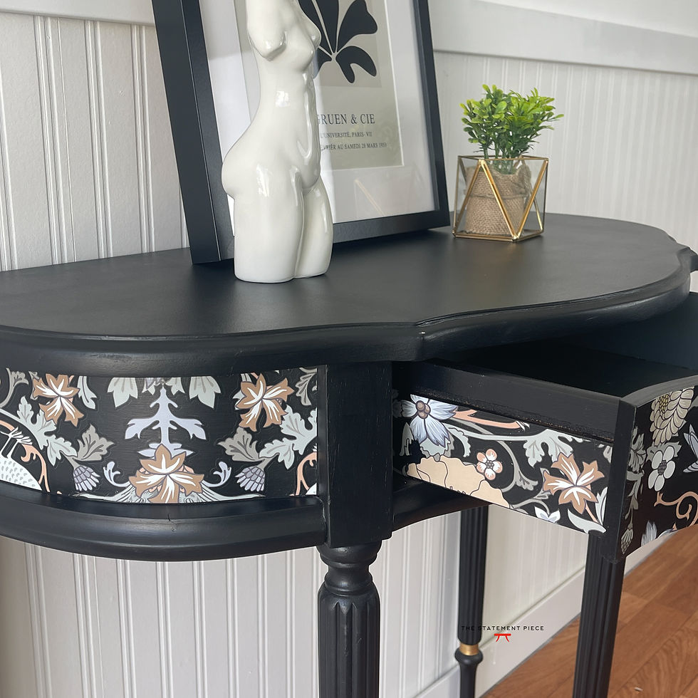 This sweet hall table has been given an upgrade from dated, varnished mahogany to sleek matt hand-painted in Coal Black by Fusion Mineral Paint with a subtle Sage colour applied to the inside drawer. A William Morris print from Iron Orchid Design was applied around the side of the table and the original brass drawer pull was restored with an added touch of gilding at the base of the legs.